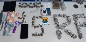 No interior do imóvel, além do casal, foram encontrados diversos objetos ilícitos, incluindo drogas, balança de precisão, materiais de endolação, eletrônicos e celulares utilizados no comércio de entorpecentes. Ambos receberam voz de prisão, tiveram os direitos constitucionais assegurados e foram apresentados na DEFLAG para as providências cabíveis.