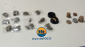 Na varredura pelo perímetro foram encontrados 12 invólucros de substância análoga à maconha, além de dinheiro trocado, caracterizando mercancia ilícita. Questionado, o jovem admitiu ser o dono da droga e que destinava a substância para comercialização.