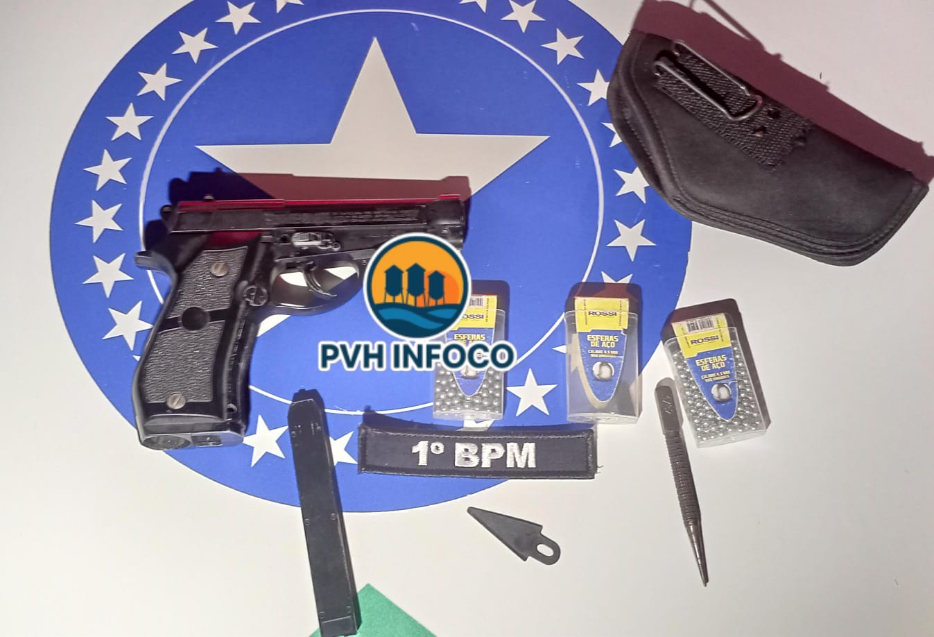 Na manhã desta segunda-feira (13), uma equipe policial foi acionada para atender uma ocorrência na Escola Estadual Araújo Lima, em Porto Velho, após informações de que um estudante estaria portando uma arma de fogo dentro da sala de aula. Ao chegar ao local, os policiais foram recebidos pela direção da unidade, que indicou a sala onde o aluno estava. Durante a revista, foi encontrada dentro da mochila do adolescente uma pistola a gás, caracterizada como simulacro de arma de fogo.