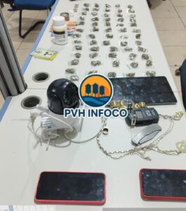 Foram apreendidos diversos objetos, incluindo valores em dinheiro, celulares, relógios, correntes, uma balança de precisão, documentos pessoais e uma câmera de monitoramento. Diante de todos os fatos constatados, a guarnição de Candeias do Jamari deu voz de prisão aos indivíduos pelo crime de tráfico de drogas, conduzindo-os, juntamente com todo o material apreendido, ao Departamento de Flagrantes para as providências cabíveis.