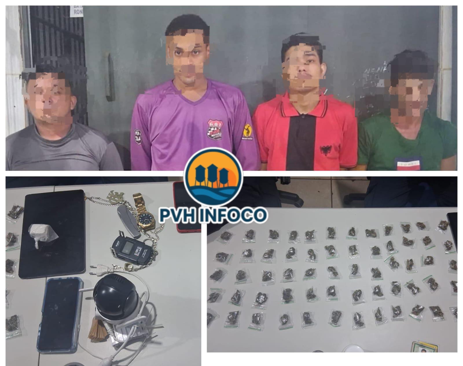 Foram apreendidos diversos objetos, incluindo valores em dinheiro, celulares, relógios, correntes, uma balança de precisão, documentos pessoais e uma câmera de monitoramento. Diante de todos os fatos constatados, a guarnição de Candeias do Jamari deu voz de prisão aos indivíduos pelo crime de tráfico de drogas, conduzindo-os, juntamente com todo o material apreendido, ao Departamento de Flagrantes para as providências cabíveis.