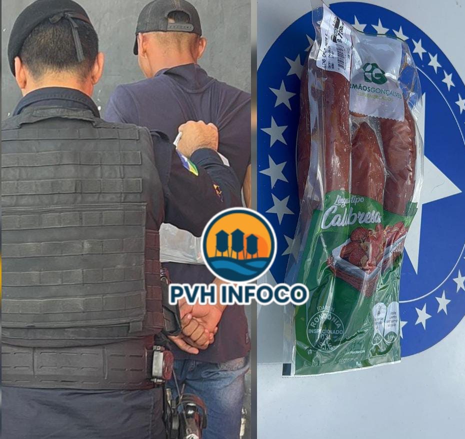De acordo com a Polícia Militar, fiscais da loja observaram pelas câmeras de segurança o momento em que o suspeito pegou um pacote contendo duas calabresas grandes e uma pequena, tentando sair sem pagar.