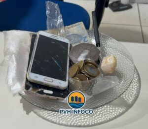 Durante a revista, os policiais encontraram porções de oxi, resquícios de cocaína, cerca de R$ 500 em dinheiro e diversos objetos de procedência duvidosa.