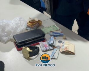Durante a revista, os policiais encontraram porções de oxi, resquícios de cocaína, cerca de R$ 500 em dinheiro e diversos objetos de procedência duvidosa.