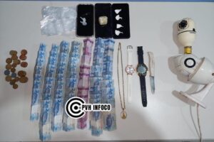 Durante a busca pessoal, foram encontrados invólucros de entorpecentes e dinheiro trocado. Em seguida, no telhado da residência, os militares localizaram uma porção grande de crack, arremessada pelo suspeito no momento da tentativa de fuga. Já no interior da casa, foram apreendidos celulares, relógios, câmeras de monitoramento, além de embalagens utilizadas para endolamento de drogas.