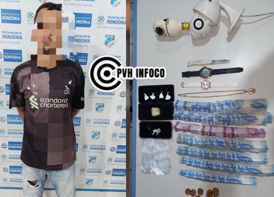 Durante a busca pessoal, foram encontrados invólucros de entorpecentes e dinheiro trocado. Em seguida, no telhado da residência, os militares localizaram uma porção grande de crack, arremessada pelo suspeito no momento da tentativa de fuga. Já no interior da casa, foram apreendidos celulares, relógios, câmeras de monitoramento, além de embalagens utilizadas para endolamento de drogas.