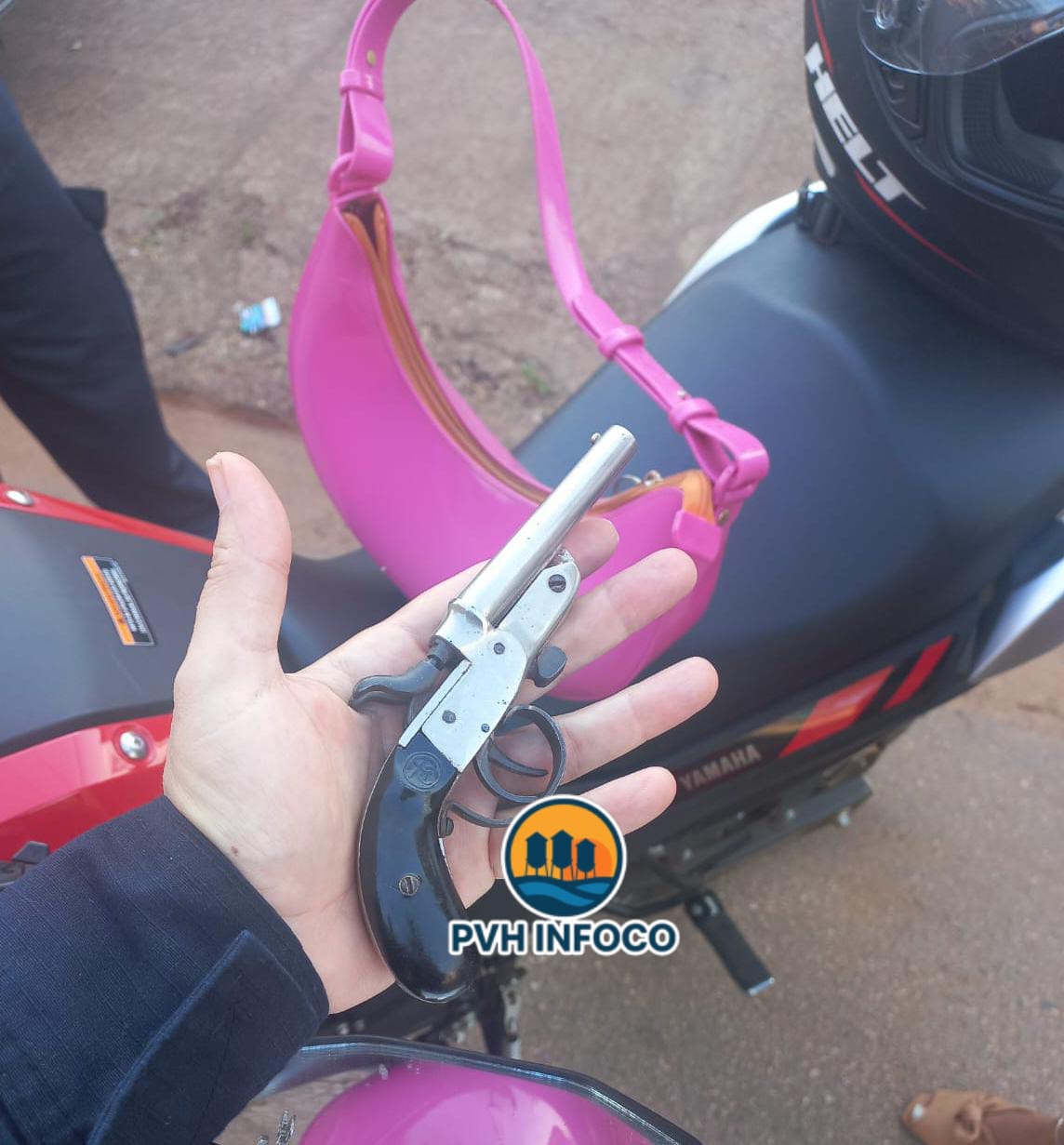 Durante a busca pessoal, dentro da bolsa da condutora foi localizada uma arma de fogo do tipo garrucha, calibre .22, de cor prata, com numeração suprimida e uma munição intacta do mesmo calibre. Também foram encontrados um aparelho celular de cor verde claro com a tela trincada, a quantia de R$ 210,00 em espécie e um documento de identidade.