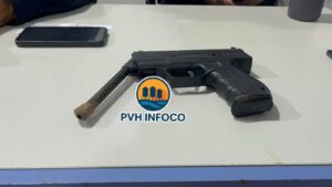 A guarnição do Reforço Comando PCSOPRF recebeu via rádio a informação de um roubo ocorrido no Skate Parque, praticado por dois homens em bicicletas. Durante diligências nas proximidades da Escola Flora Calheiros, foram avistados dois suspeitos com as mesmas características repassadas. Na abordagem, um deles arremessou ao chão um celular e uma arma de fogo, que foram apreendidos. A vítima de 15 anos reconheceu o autor, relatando que ele havia apontado a arma em sua direção para subtrair seu aparelho celular. Outra vítima também confirmou ter sido abordada pela dupla, que utilizava uma arma para ameaçar e roubar seus pertences, incluindo um celular Samsung A54 e uma bicicleta de cor preta.